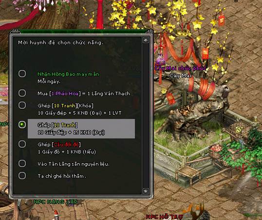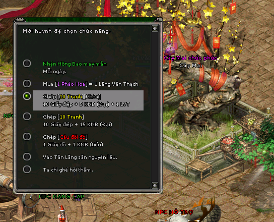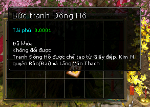 + Sử dụng 10 Giấy Điệp + 5 Kim Nguyên Bảo ( Đại ) + 1 Lăng Vân Thạch sẽ được 10 Tranh Đông Hồ ( Khóa )