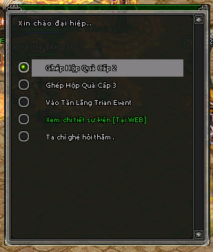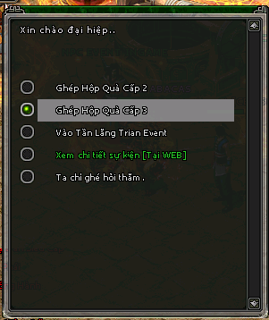 Đối thoại NPC Event InGame chọn : Ghép hộp quà cấp 3 Lưu ý : 20 Hộp Quà Cấp 2 + 1 Lăng Vân Thạch + 5 Kim Nguyên Bảo (đại) = 10 Hộp Quà Cấp 3 |