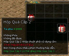 Sử dụng Hộp quà cấp 2 ( tốn 1 Kim Nguyên Bảo - Tiểu ) sẽ nhận được ngẫu nhiên 1 phần thưởng sau: